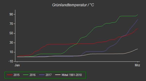 | Beginn der nachhaltigen Vegetationsperiode | Montag, 27. März 2017 16 Tage eher als im Mittel 1981-2010 |