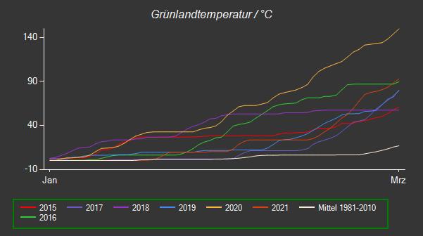 | Beginn der nachhaltigen Vegetationsperiode | Samstag, 3. April 2021 9 Tage eher als im Mittel 1981-2010 |