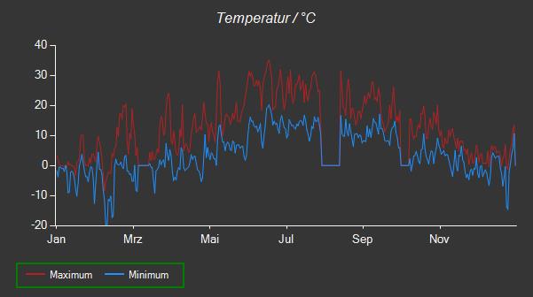 | Monat | TAussen (°C) | TSonne (°C) | TD (°C) | Tgefühlt Aussen (°C) | Tgefühlt Sonne (°C) | FeuchteAussen (%) | Luftdruck (hPa) | Wind (m/s) | Niederschlag (mm) | Sonnenscheindauer (h) |