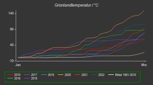| Beginn der nachhaltigen Vegetationsperiode | Donnerstag, 24. März 2022 19 Tage eher als im Mittel 1981-2010 |