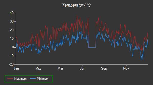 | Monat | TAussen (°C) | TSonne (°C) | TD (°C) | Tgefühlt Aussen (°C) | Tgefühlt Sonne (°C) | FeuchteAussen (%) | Luftdruck (hPa) | Wind (m/s) | Niederschlag (mm) | Sonnenscheindauer (h) |