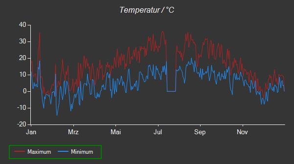 | Monat | TAussen (°C) | TSonne (°C) | TD (°C) | Tgefühlt Aussen (°C) | Tgefühlt Sonne (°C) | FeuchteAussen (%) | Luftdruck (hPa) | Wind (m/s) | Niederschlag (mm) | Sonnenscheindauer (h) |