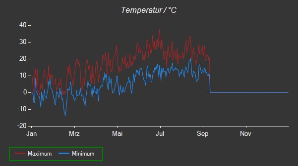 | Monat | TAussen (°C) | TSonne (°C) | TD (°C) | Tgefühlt Aussen (°C) | Tgefühlt Sonne (°C) | FeuchteAussen (%) | Luftdruck (hPa) | Wind (m/s) | Niederschlag (mm) | Sonnenscheindauer (h) |