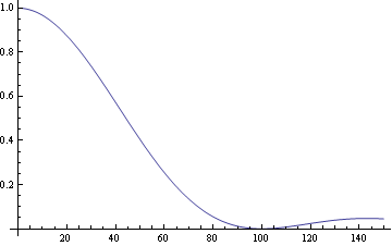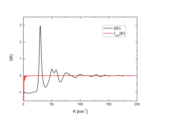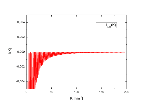 Die Abbruchoszillationen sind sogar schon unterhalb eines möglichen Vormaximums zu vernachlässigen, so dass davon auszugehen ist, das Abbruchoszillationen im Impulsraum keinen Fehler verursachen, weder in zusätzlichen Maxima, noch in der Verschiebung von Maxima und auch nicht in einer Änderung der Intensität.