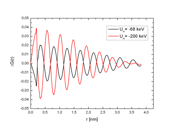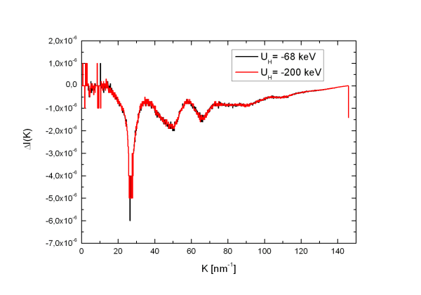Eine testweise Auswertung mit den verschiedenen Beschleunigungsspannungen (UH = 0 eV, UH = -68 keV, UH = -200 keV) ergab bei der Dichte eine maximale Abweichung von 0,1%. Die Unterschiede in den Intensitäten sind sogar noch geringer (s. Abb. 4 und 3).